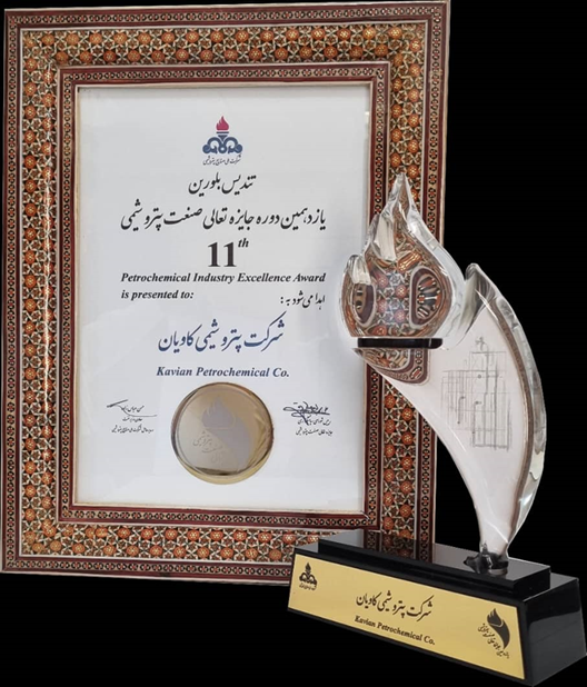 به همین مناسبت لوح تقدیر و تندیس بلورین جایزه تعالی صنعت پتروشـیمی از سوی مدیر عامل شرکت ملـی صنایع پتروشیمی آقای دکتر عباس زاده به آقای دکتر اولادی مدیر عامل شرکت پتروشیمی کاویان اعطا گردید.